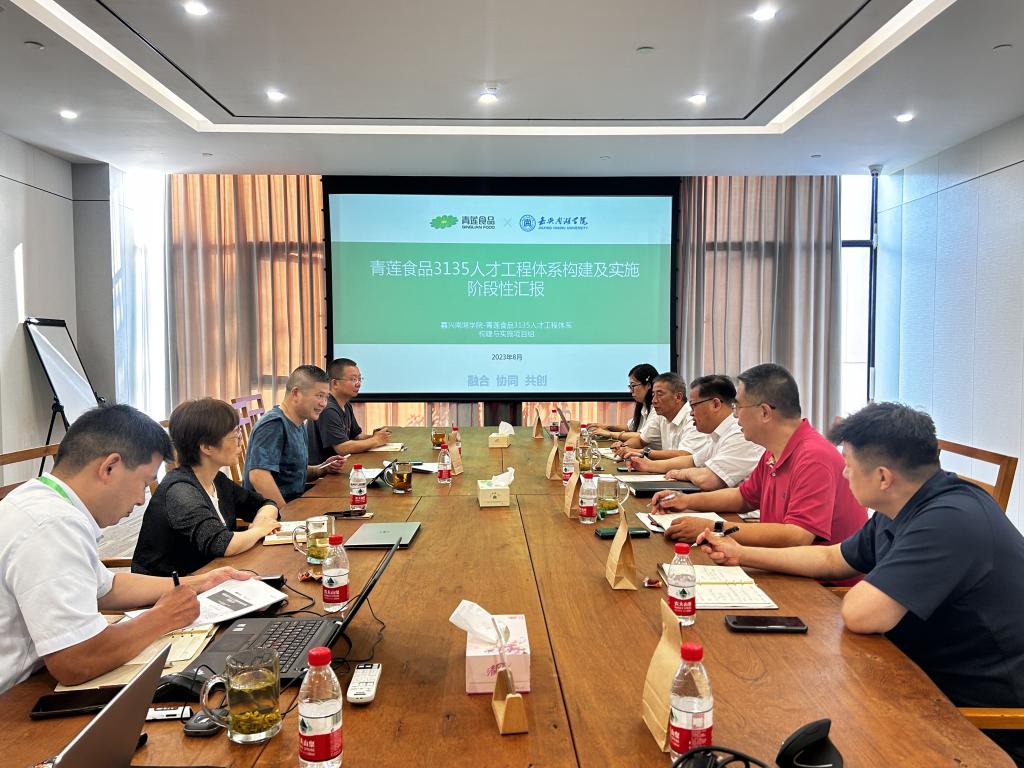 8月12日下午,嘉兴市政协副主席、校党委书记盛付祥带队赴浙江青莲食品股份有限公司听取青莲食品3135人才工程体系构建与实施项目阶段性汇报,并深入推进“校企博士共享工程”。浙江青莲食品股份有限公司董事长许明曙、总裁办主任晏波、人资行政中心总监居娟华、审计总监葛慧、商学院培训主管邓飞陪同,我校袁志明副校长、beat365在线唯一官网院长孔冬参会。