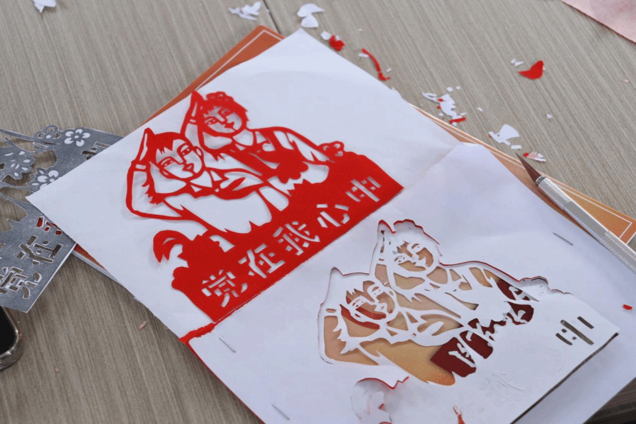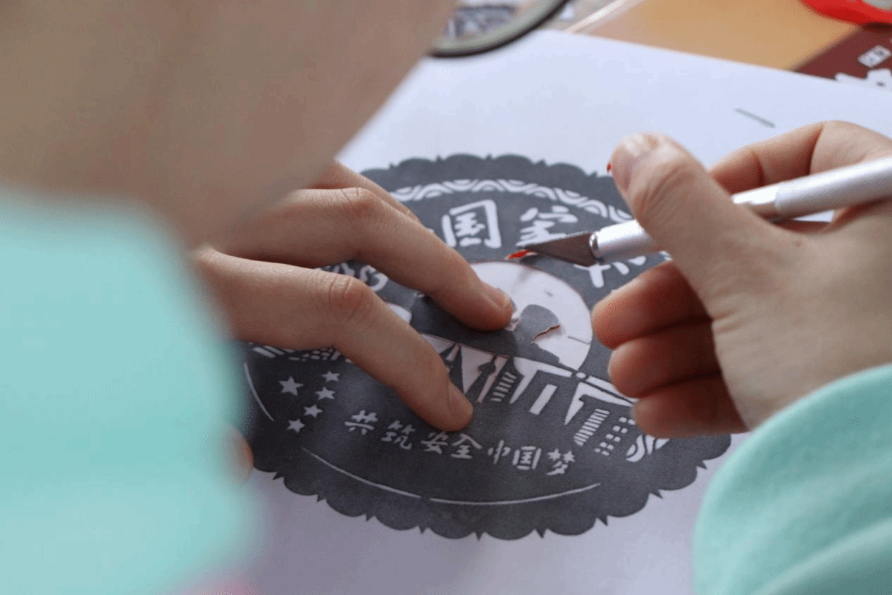 紧接着,文创饰品协会的成员们带领清河社区的居民们以刀为笔,在鲜艳的红纸上一起一落,刻画出细腻的安全图案。一幅幅刻纸作品展示着大家政治安全、经济安全、文化安全等国家安全重点领域的认识,作品线条粗犷有力,人物栩栩如生,充分展现了大学生和社区居民对总体国家安全观内涵的理解,以及对新时代国家安全成就的感悟。