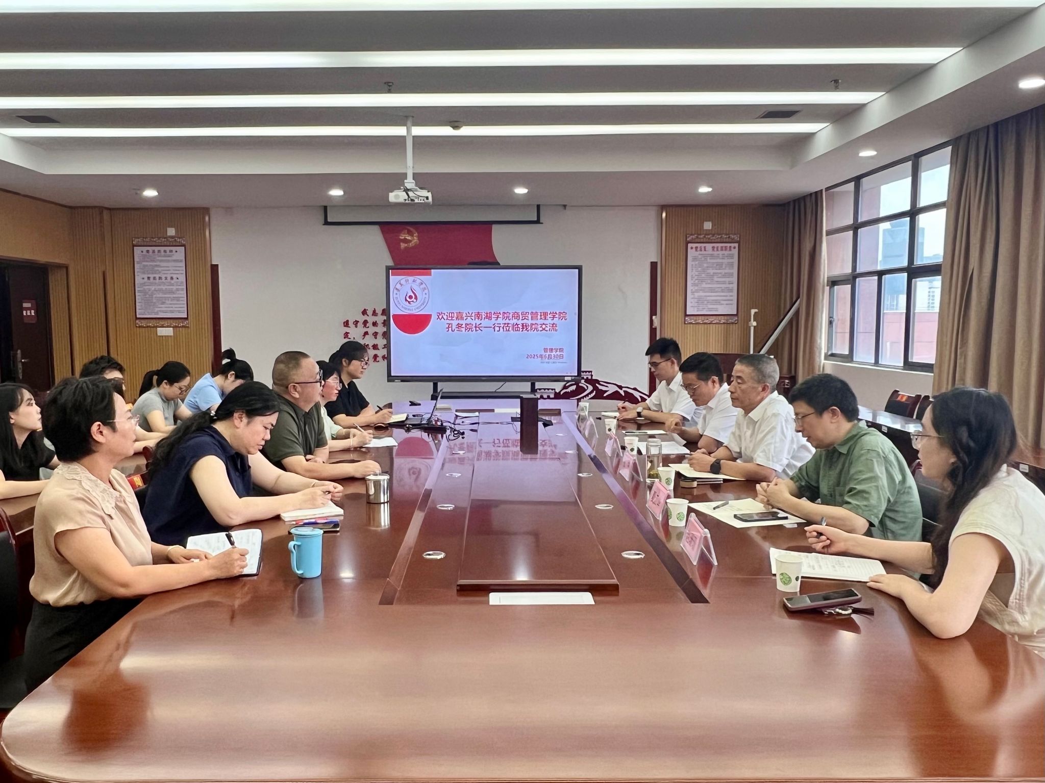 在延安大学经济与管理学院,董庆来院长代表学院对孔冬院长一行的到来表示热烈欢迎。座谈交流会上,双方就工商管理学科建设、专业建设、师资队伍建设、人才培养和学生教育管理等进行了深入探讨和交流。座谈会由延安大学经济与管理学院党委副书记冉晓辉主持,副院长李兴开、白鹏飞、杜涛等领导参加座谈会。座谈会前,董庆来院长、冉晓辉副书记陪同孔冬院长一行参观了延安大学校史馆,了解延安大学历史沿革、发展和办学成就、红色育人成效,以及红色文化资源利用方面的先进经验与典型做法。