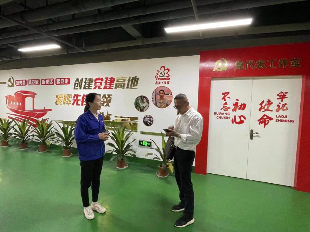 桐昆集团洲泉工业园“党代表”工作室负责人胡晓丽就园区党建组织建设、党员志愿服务队发挥作用、平安治理矛盾调解、“党代表”工作室服务内容等方面进行详细介绍。在访谈中,胡晓丽分享了参加中国共产党第十八次全国代表大会的深刻体会,并介绍了她工作近30年期间,多次在技能竞赛中拔得头筹,荣获全国五一劳动奖章的经历。胡晓丽同志的爱岗敬业、谦慎认真、积极乐观的态度感染了参与调研的各位老师。