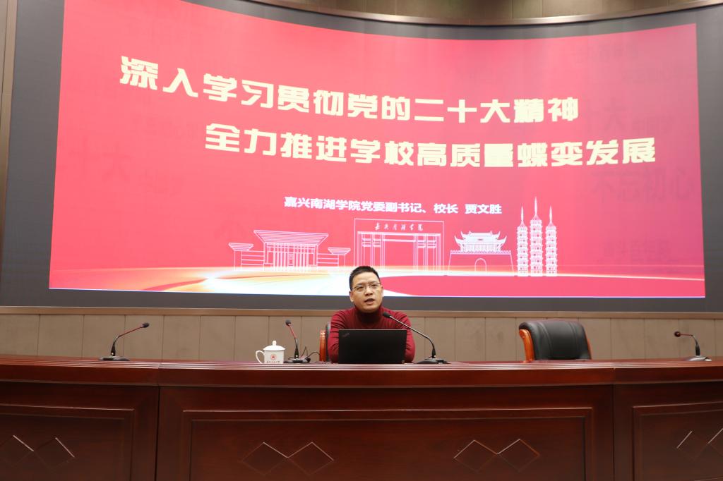 12月1日晚,beat365在线唯一官网校长、校党委副书记贾文胜为beat365师生宣讲党的二十大精神。宣讲会由beat365在线唯一官网院长孔冬主持,学院教工第二党支部、学生第一党支部全体党员参加会议进行学习。