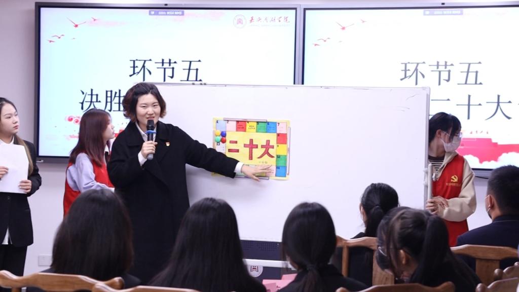 随着主持人宣布活动开始,比赛正式拉开帷幕。知识抢答环节分为必答题和抢答题两部分,题型类别涵盖单选、多选、填空和简答。“中国共产党人的初心使命是什么?”“中国式现代化的本质要求有哪些?”在主持人读题结束,各组选手在有限的时间内迅速起身作答,现场气氛紧张热烈,引得阵阵掌声。在爱国歌曲接力赛环节,选手们通过“我和我的祖国,一刻也不能分割”“家是最小国,国是千万家”等歌声接力,回忆党和国家的峥嵘岁月,体会爱国歌曲所带来的强大精神感召力。在“你画我猜”环节中,各小组代表抽取对应的内容进行绘制,组内同学进行回答。“五四运动”“秋收起义”“百团大战”“两弹一星”等一系列历史大事件名词,透过选手们极富想象力的描绘,为观众们呈现出一幅幅令人印象深刻的作品。在红色电影展播环节中,各小组成员通过观看《飞夺泸定桥》《建党伟业》《历史转折中的邓小平》等爱国系列影视作品片段,进行迅速作答展现的历史事件。最后“趣味飞行棋”环节中,各小组代表通过掷骰子,以抛出的数字,确定前进单位格数,进行相应的移动,直至到达第二十格。各支部成员深思熟虑、商量对策、从容不迫对待各个关卡,比赛成绩此起交替上升,场上气氛热烈,掌声经久不息。