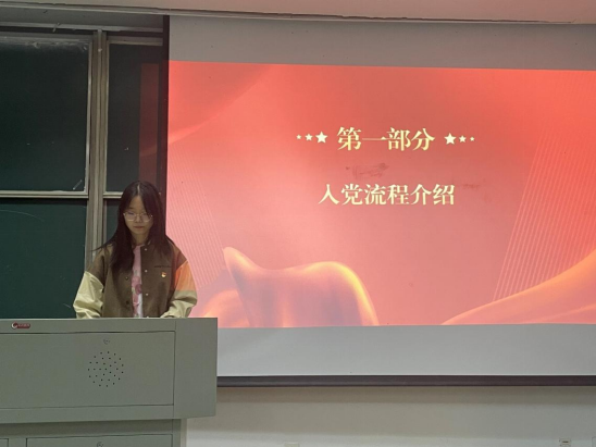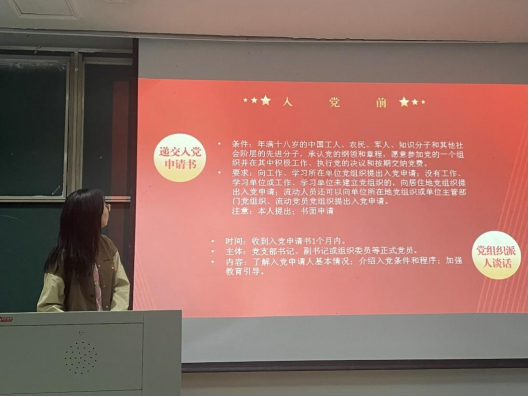 本次会议由顾因贝同志主持并宣讲,她向在场入党申请人和入党积极分子详细介绍了入党流程以及注意事项,包括申请入党的条件、入党申请书的撰写、入党积极分子的确定和培养、发展对象的确定和考察、预备党员的接收和转正等各个环节。同时,对入党申请书、思想汇报等材料的撰写要求及注意事项作了细致讲解。鼓励同学们在生活中严格要求自己,在学好知识的同时,主动参加各类实践活动,努力提升自己的政治素质和思想觉悟,自觉培养先锋模范意识,端正入党动机,进一步向党组织靠拢。