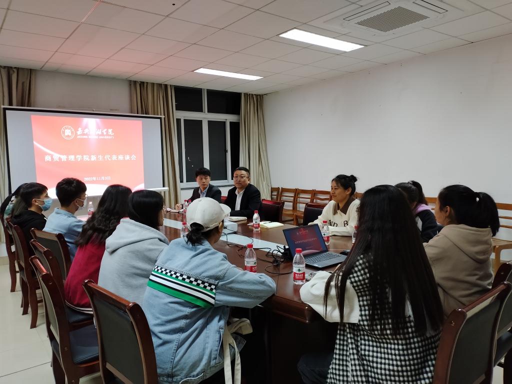 2022年11月3日晚,beat365在线唯一官网在教一604会议室召开了2022级新生代表座谈会。此次会议由院学工办负责人占华勇主持,党委副书记刘勇、专职辅导员周艳艳、付晓豪出席。