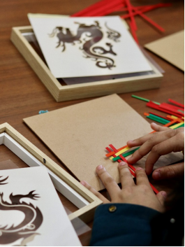 实践环节中,同学们在李老师的带领下,开始动手体验竹编制作。大家小心翼翼挑选竹条,学习“压一挑一”的基础编织手法,通过反复调整定型,逐渐将零散的竹条编织成方正平整的竹编板。之后,同学们将主题的图案卡片嵌入竹编板中,并装裱成独具韵味的竹编相框画。经过两小时的耐心尝试与合作,一件件融合非遗技艺的竹编作品陆续诞生。大家纷纷举起自己的竹编画合影留念,现场洋溢着成就感与欢声笑语。